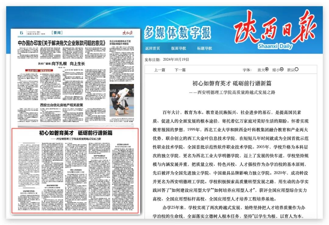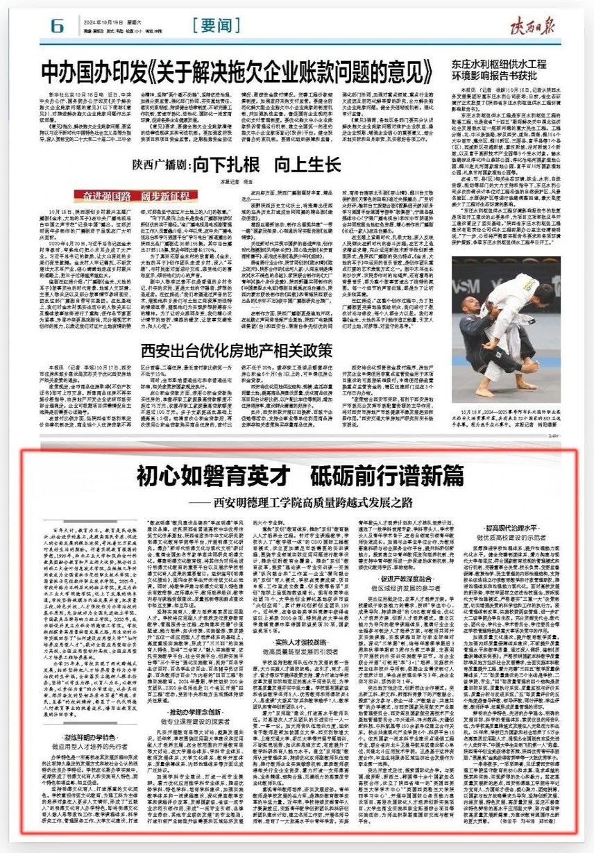 华体会(中国)自1999年创办以来,全面落实立德树人根本任务,把质量立校、特色兴校、人才强校作为办学治校的基本原则,以务实创新、踔厉奋发的坚韧品质书写着“明德、亲民、至善”的校训精神,彰显了一代代明德人对教育的执着追求,谱写出高质量跨越式发展的壮丽华章。10月19日,《陕西日报》对我校的办学历程、办学特色、办学经验和办学成就给予报道,引起社会广泛关注和好评。