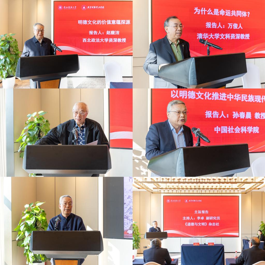 主旨发言第一阶段由《道德与文明》杂志社副研究员李卓主持,西北政法大学赵馥洁教授以《明德文化的价值意蕴探源》为题,从历史的探究和价值哲学的两个方面探讨了明德文化的历史渊源和价值意蕴。清华大学万俊人教授以《为什么是命运共同体?》为题,阐释了何为命运共同体及其可能面临的道德伦理问题。陕西师范大学刘学智教授以《中华明德文化的现代价值刍议》为题,认为明德文化是当前探讨马克思主义与中华优秀传统文化相结合的一个重要的方面,是对中华传统文化进行创造性转化和创新性发展的一个可借鉴的文化资源。中国社会科学院孙春晨教授以《以明德文化推进中华民族现代文明建设》为题,阐述了在实现强国建设、民族复兴的过程中,明德文化对于推进中华民族现代文明建设的重要意义。中国人民大学肖群忠教授以《明德文化与重德精神》为题,对明德文化的内涵及其在教化育人方面的价值作了阐释。