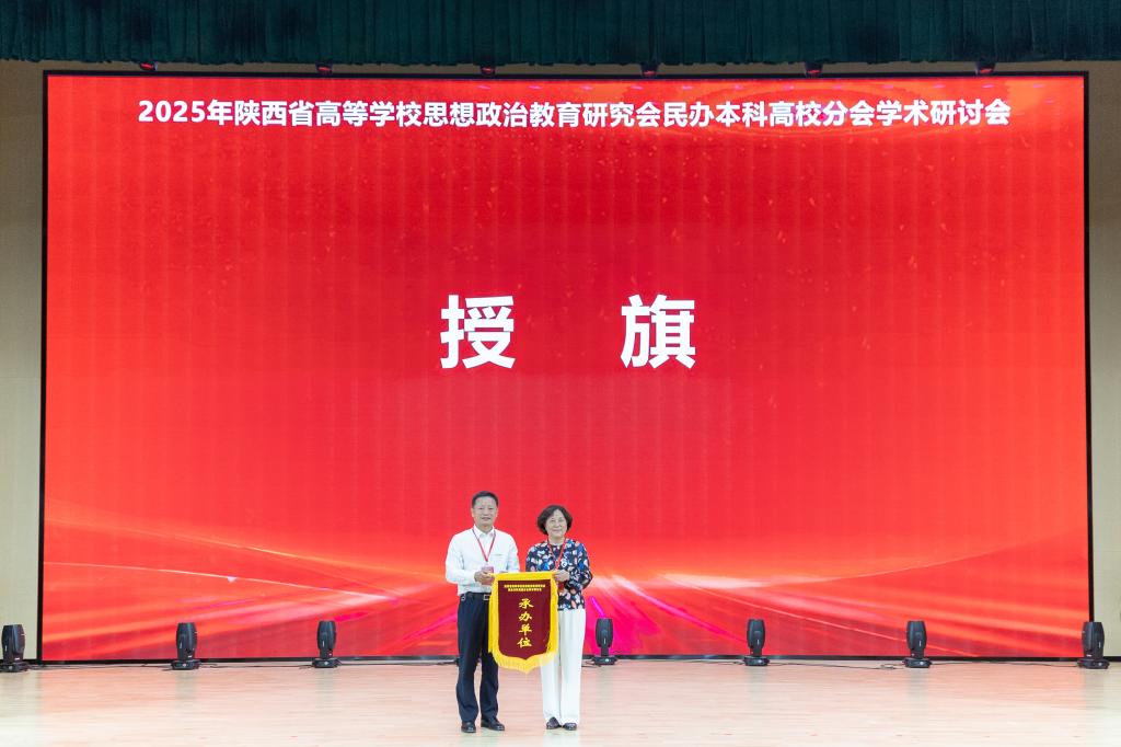 马川鑫代表本次学术研讨会承办单位华体会(中国)向下一届学术研讨会承办单位西安交通工程学院授旗,西安交通工程学院党委书记李萍接旗并做表态发言。