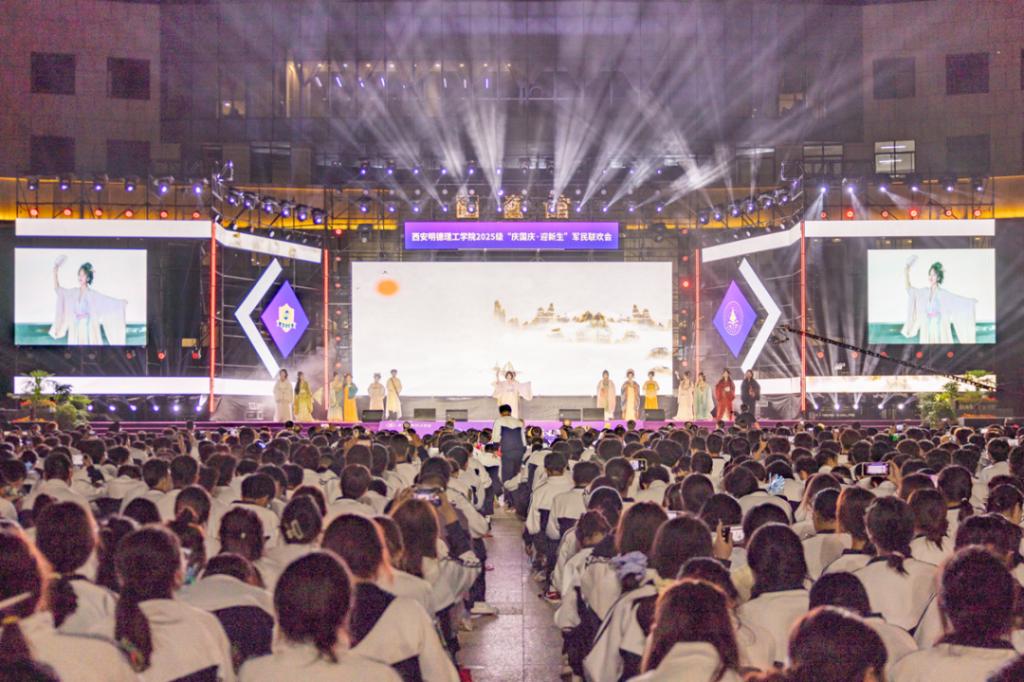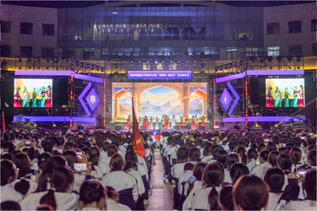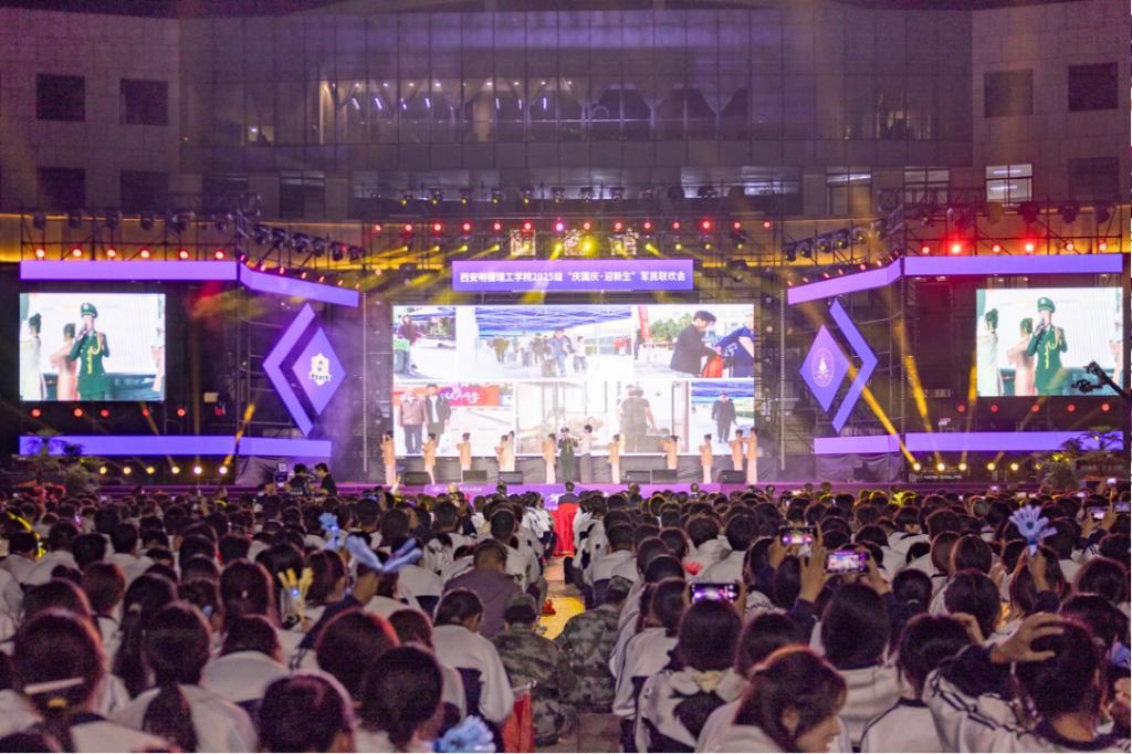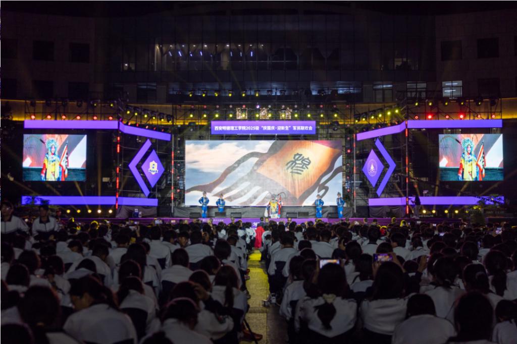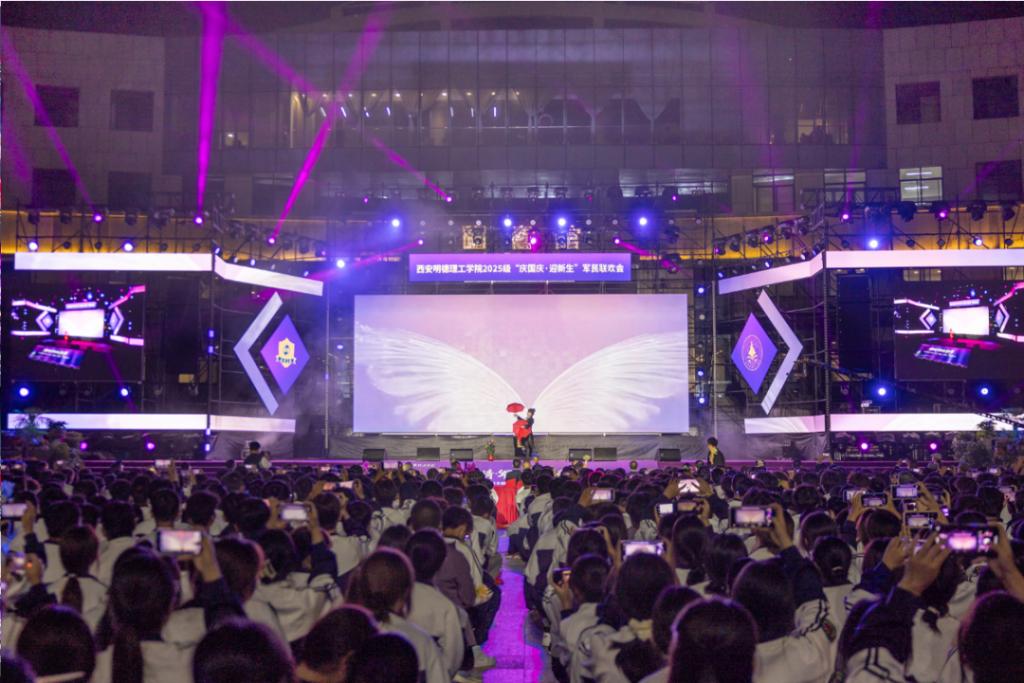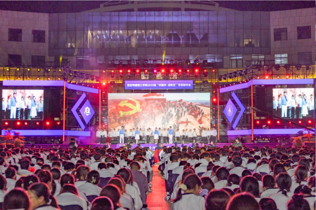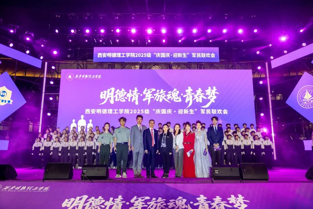 9月19日晚,“明德情·军旅魂·青春梦”2025级“庆国庆·迎新生”军民联欢会在学校中心广场盛大举行。陕西金叶科教集团董事局主席、总裁,明德源教育集团董事长、总裁,学校董事长、执行校长袁汉源,陕西金叶科教集团监事会主席冯卫平,陕西金叶科教集团董事王毓亮,陕西金叶科教集团副总裁秦忠,陕西金叶科教集团副总裁陈宏团,陕西金叶科教集团财务总监熊汉城,明德源教育集团常务副总裁、学校副董事长、执行董事张琳,学校校长王志刚,学校党委书记马川鑫,以及明德源教育集团领导、全体校领导,学校各职能部门、教辅单位、二级学院领导,全体军政干部、2025级全体学生、家长代表参加此次晚会。