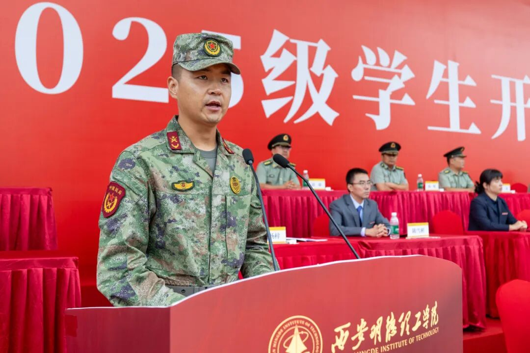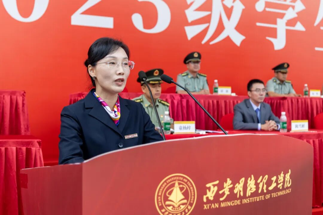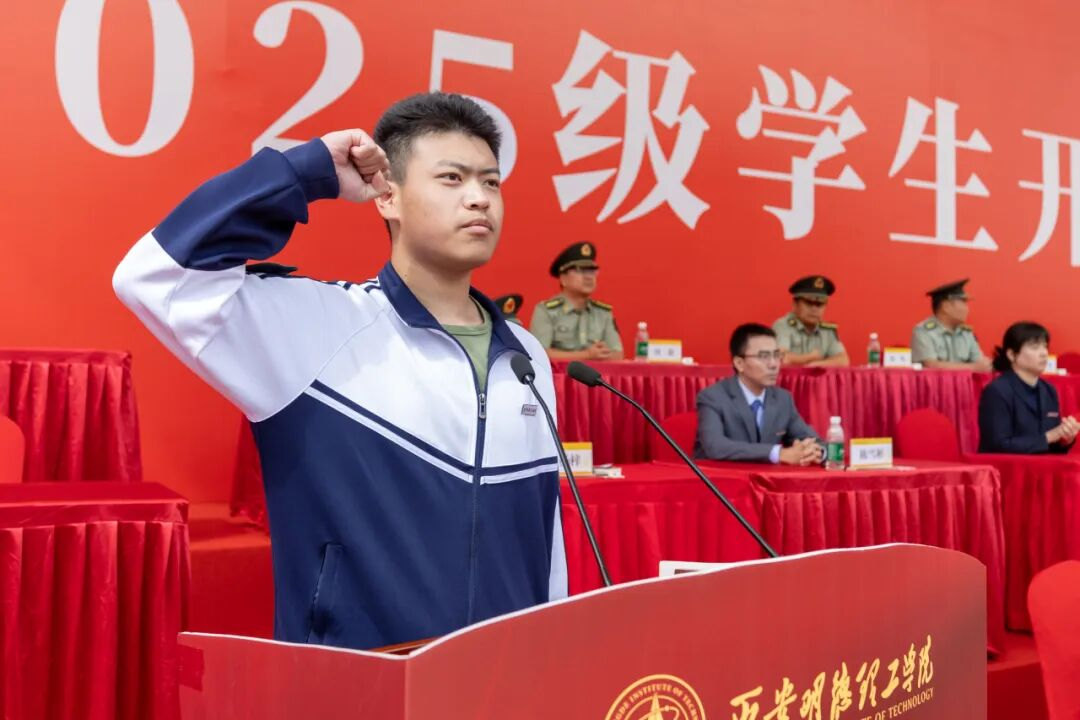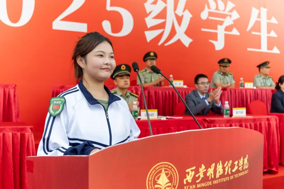 新生代表经济与管理学院王思彤同学发言。她回顾了军训期间的成长与感悟,感恩学校的培养与师长的教诲,号召全体新生,以“明德、亲民、至善”为人生灯塔,于勤学中修身立德,在明辨里笃定前行,在明德理工学院这片充满希望的沃土上,挥毫泼墨,谱写出一曲无悔青春的华美乐章。