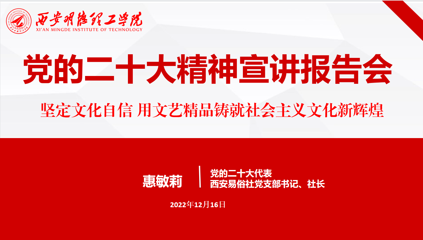 报告结束后,校党委副书记董昊做总结讲话。他表示,惠敏莉同志通过自身工作实际体会,紧紧围绕党的二十大精神,向与会师生展示了易俗社百年名社千年文化。董昊副书记号召全体师生以此次宣讲报告为契机,发挥文化创造活力,进一步深入学习贯彻党的二十大精神,学习惠敏莉同志“试玉要烧三日满,辨材须待七年期”的文艺教育精神,为建设高水平艺术学科而积蓄能量。