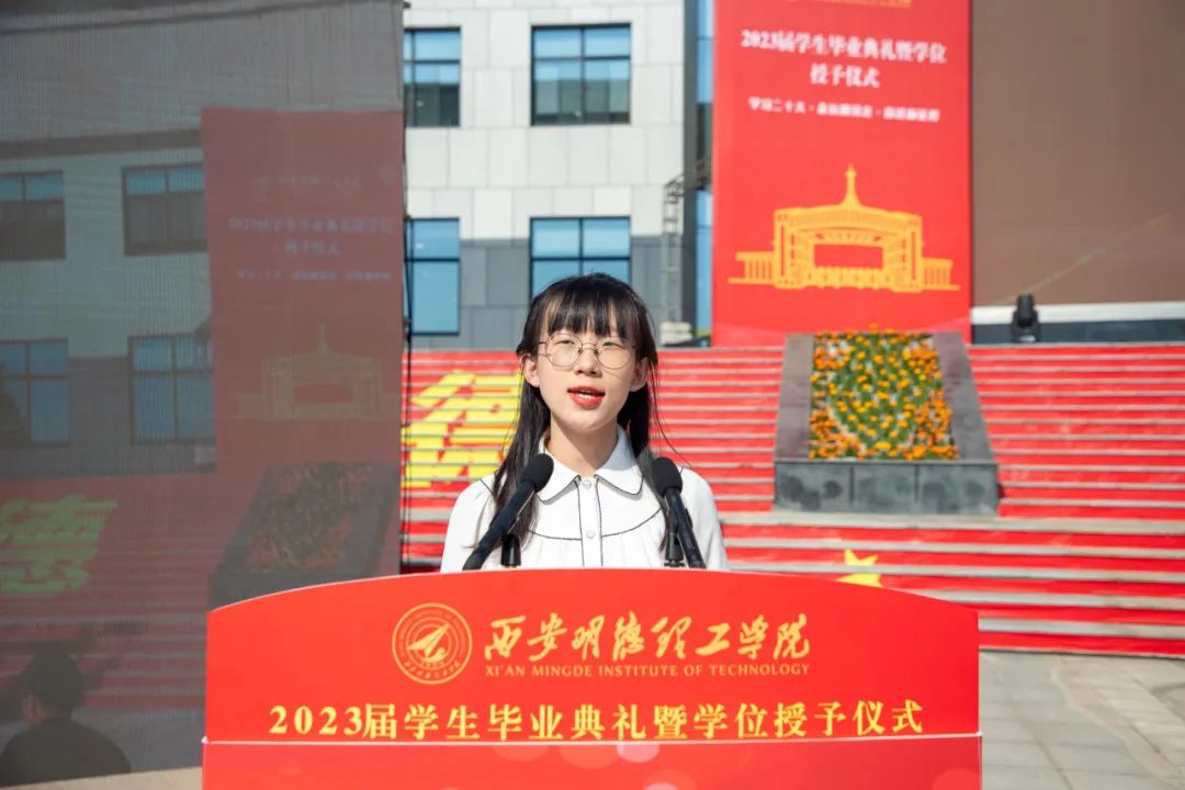 毕业生代表左欣悦同学表达了对母校的诚挚谢意和惜别之情,表示将带着在明德塑造的优良品格、锻炼出的过硬本领、收获到的宝贵学识,踏上新的人生征程,积极向上,志存高远,奉献社会,用拼搏与超越赢得灿烂与辉煌。