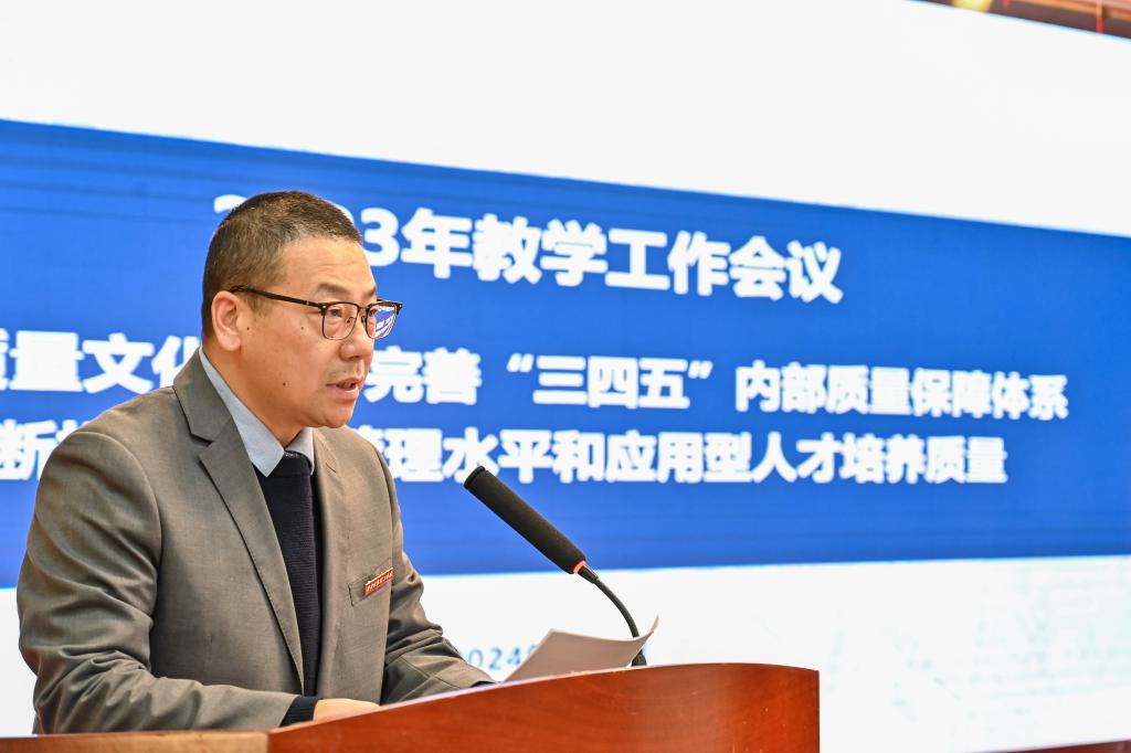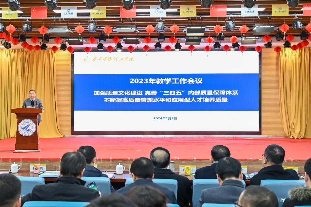 1月9日下午,学校在建德楼组织召开2023年教学工作会议。此次会议主题为“加强质量文化建设,完善‘三四五’内部质量保障体系,不断提高质量管理水平和应用型人才培养质量”。全体校领导,各二级学院领导班子、办公室主任、专业负责人、教研室主任、课程负责人、教务员、质量管理员、教师代表、辅导员代表,各职能部门、教辅单位负责人,教学督导及教务处、质量管理与评估办公室全体人员等270余人参加了此次会议,会议由副校长朱延波主持。
