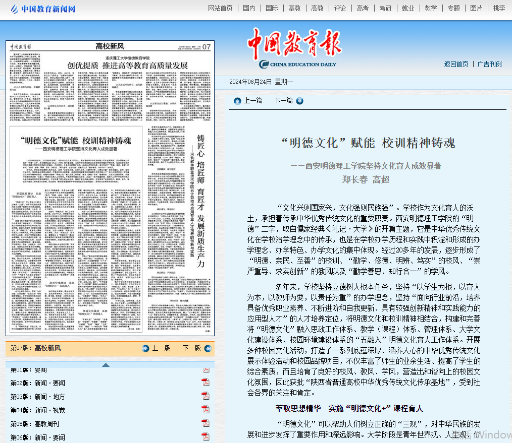 6月24日,《中国教育报》第七版(高校新风)以《“明德文化”赋能 校训精神铸魂——华体会(中国)坚持文化育人成效显著》为题,报道我校文化育人工作。