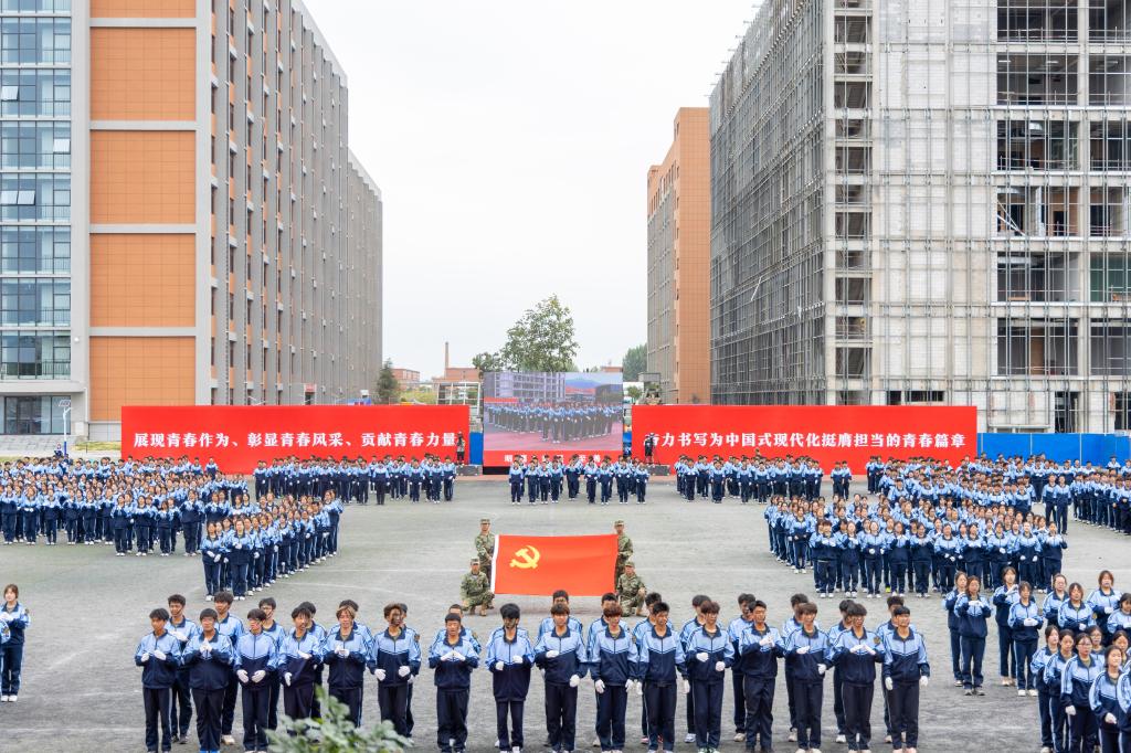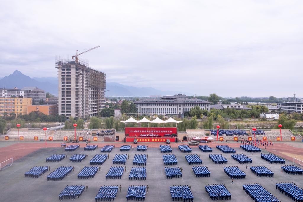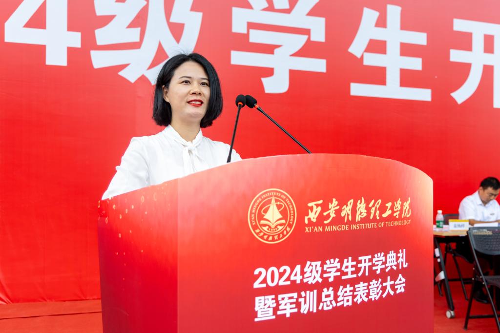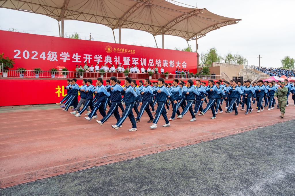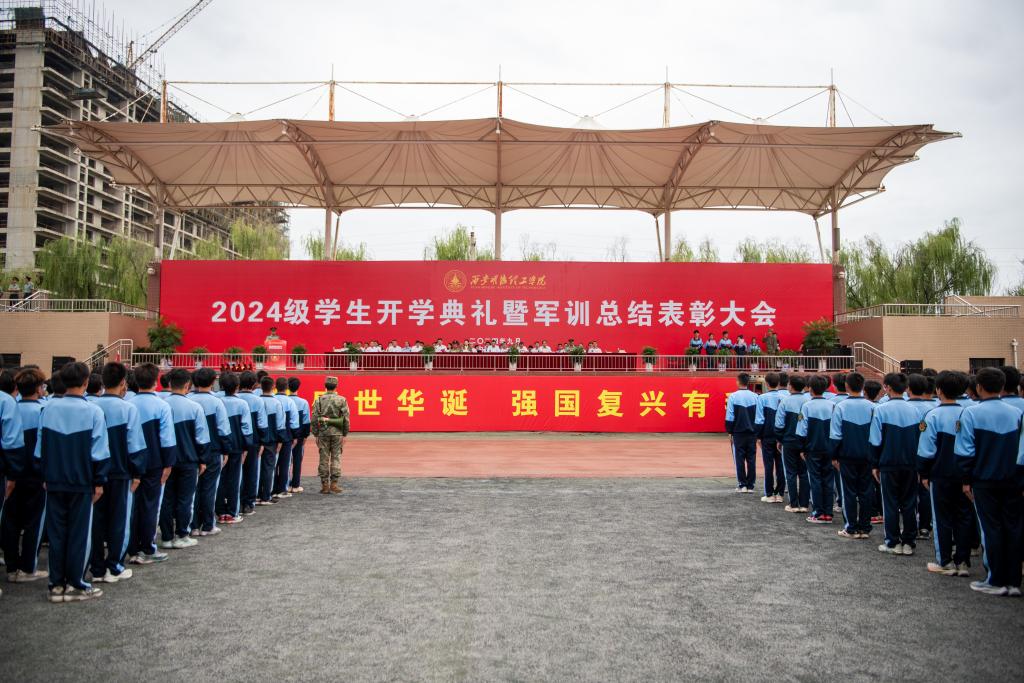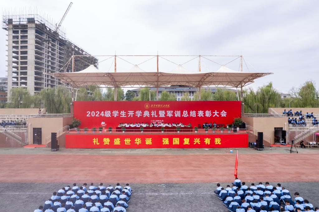 9月21日上午,学校2024级学生开学典礼暨军训总结表彰大会在学校运动场隆重举行。陕西金叶科教集团副总裁秦忠,董事局秘书闫凯,明德源教育集团助理总裁兼常务副总裁、学校副董事长张琳,学校校长王志刚,党委书记马川鑫,长安区人民武装部部长张引良,明德源教育集团财务总监田雪,学校副校长朱延波、陈鹏,财务总监马晓军,学校军训团团长张军闯出席大会,明德源教育集团、学校各学院、职能部门、教辅单位领导,全体军政干部、2024级全体学生、家长代表参加大会。会议由学校党委副书记、副校长、军训团政委刘星主持。
