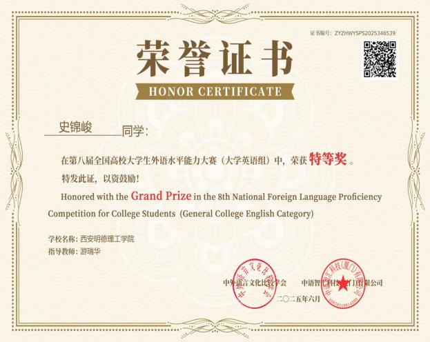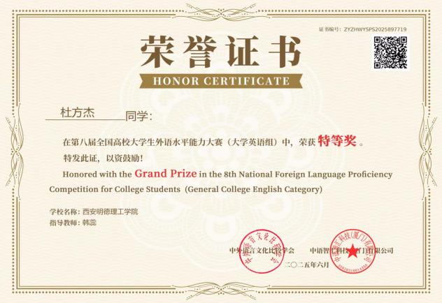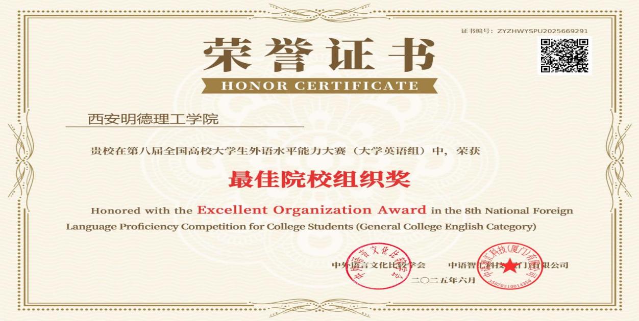 尤为值得一提的是,凭借出色的赛事组织工作、高质量的参赛表现以及极高的学生参与度,我校被大赛组委会授予“最佳院校组织奖”,成为本届赛事中为数不多获此殊荣的高校之一。这一荣誉不仅是对我校大学英语教学水平的肯定,更是对我校人才培养质量的高度认可。