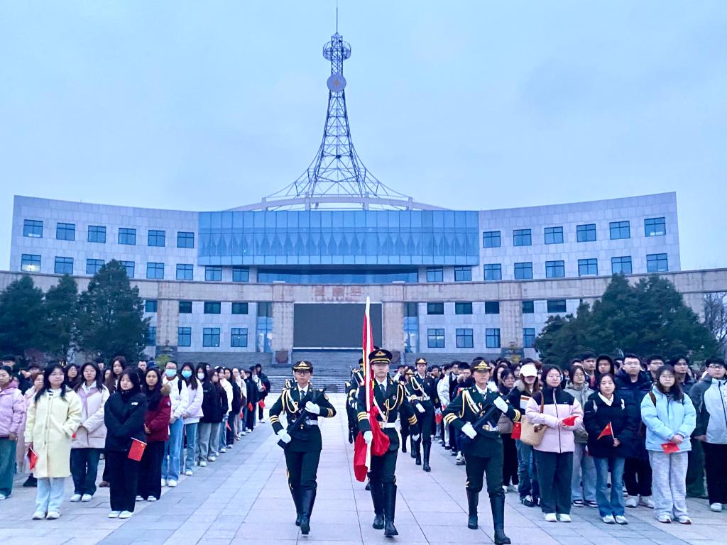 在激昂雄壮的国歌声中,鲜艳的五星红旗缓缓升起,迎风招展,熠熠生辉。这一庄严瞬间,在场的每位师生心中都涌动着澎湃的激情,他们的目光坚定而专注,紧紧追随那面迎风飘扬的国旗。