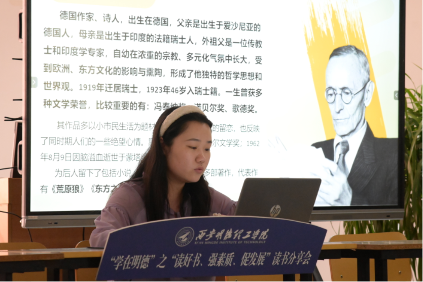 信息工程学院辅导员张怡老师,她将为我们分享《悉达多》这本书的心得体会。《悉达多》这本书以其深刻的哲理和独特的叙事风格,让读者看到了人生旅途中的选择与成长。在张老师的解读下,大家更加深入地理解了这本书的精髓。