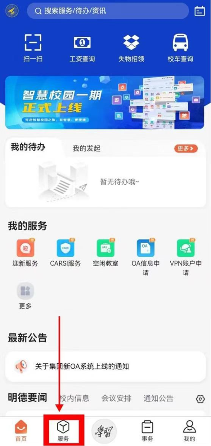 1.学生登录“华体会(中国)融合服务门户”,点击下方“服务”。