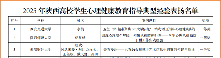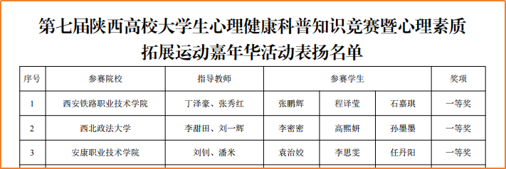 近日,中共陕西省委教育工委印发了《关于第十届陕西高校“阳光护航”心理育人宣传季实践活动成果展示表扬名单的通知》,学校在多项比赛中斩获佳绩,充分展现了学校心理健康教育工作的丰硕成果。