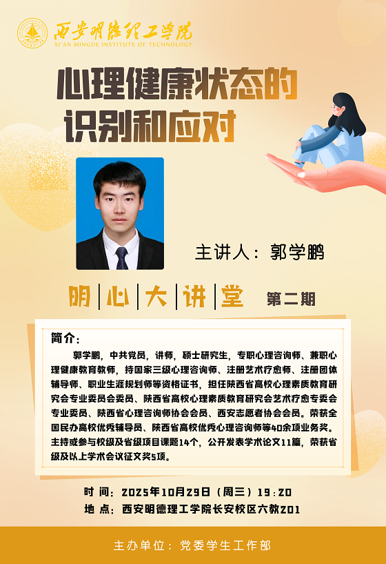 一、培训时间2025年10月29日 19:20二、培训地点华体会(中国)长安校区六教201三、报告会专家党委学生工作部 郭学鹏四、培训对象 信息工程学院班级与宿舍心理委员今晚我们不见不散~