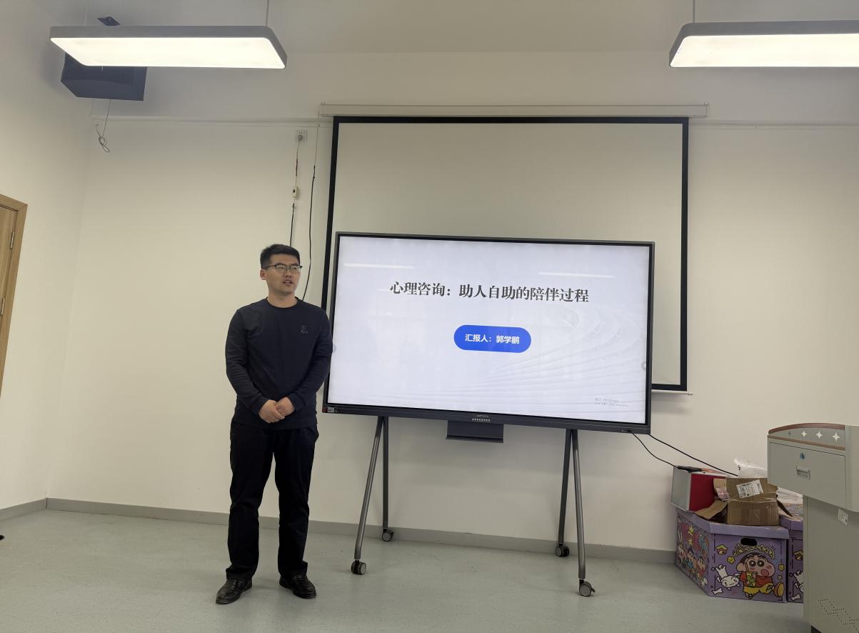 会议开始,由郭学鹏老师,曹源老师、刘思瑞老师做工作经验分享。郭学鹏老师分享了初次会谈中开展摄入性会谈的技巧与方法。曹源老师分享了咨询记录表的填写规范及注意事项。刘思瑞老师分享了关于如何精准聚焦来访者诉求的提问技巧。