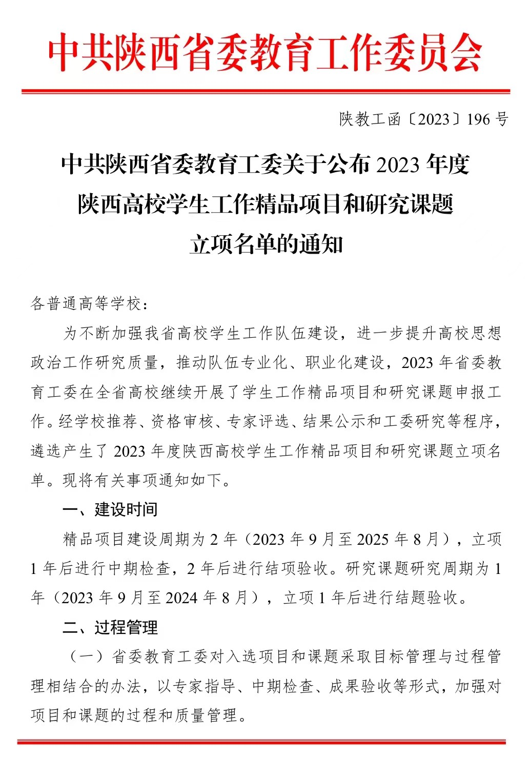 根据《中共陕西省委教育工委关于公布2023年度陕西高校学生工作精品项目和研究课题立项名单》的通知,经学校推荐、资格审核、专家评选、结果公示和工委研究等程序,中共陕西省委教育工委研究同意立项学生工作精品项目32个、研究课题112个。我校一项辅导员课题研究项目获得省级立项。