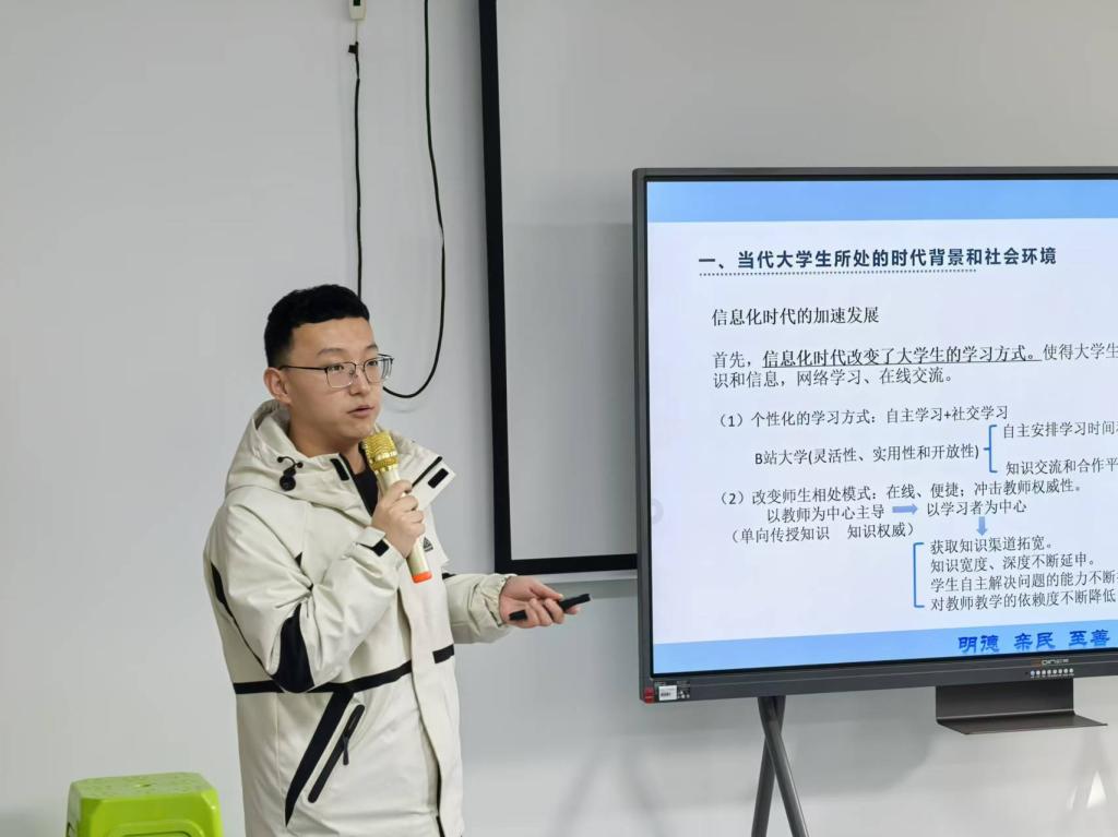 信息工程学院辅导员王旭光以《学思践悟,赋能成长----辅导员开展日常管理工作的心得分享》为题,结合2024年全省辅导员培训内容,从当代学生的思想行为特征及规律、网络不良言论的特征分析与应对、马克思主义宗教观的教育与引导学生心理危机的识别与应对以上四点进行分享。他表示,辅导员要深刻认识立德树人根本任务的核心要义,看齐高线、紧扣主线、坚守底线,在思想引领、日常管理、活动组织中发挥好辅导员的重要支撑作用。