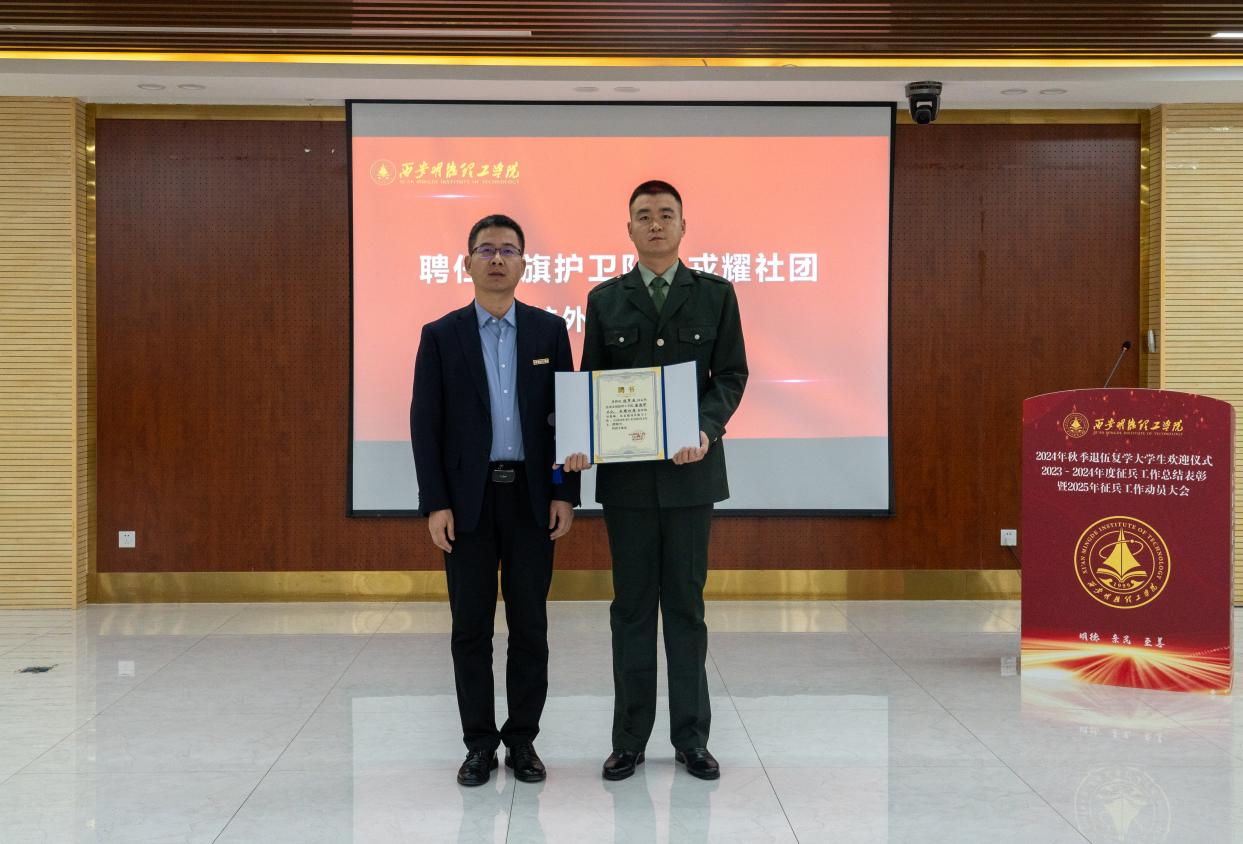 国无防不立,民无兵不安”,为了更好加强青年思想政治建设,发挥好军事类学生社团在弘扬爱国主义精神,培养国防意识方面的积极作用。会上,学校人武部特聘请我校2024级学生军训团团长张军闯为我校国旗护卫队和戎耀学生社团校外指导教师。刘星为校外指导教师张军闯颁发聘书。