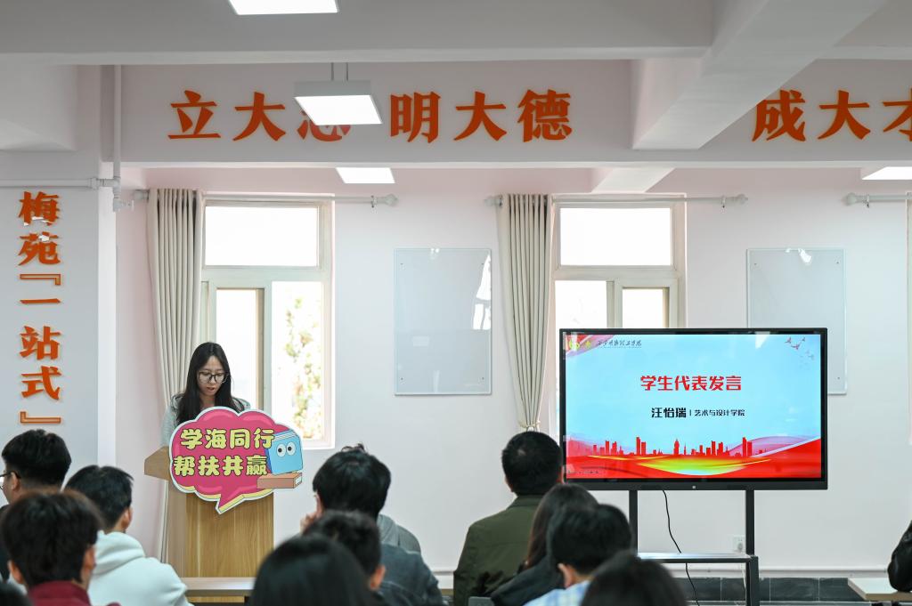 随后,来自艺术与设计学院的学生代表汪怡瑞发言。她站在受助学生的角度,讲述了“学业加油站”给自己的学习生活带来的巨大改变。引发了在场同学们的强烈共鸣,也让大家更加深刻地认识到“学业加油站”的重要价值。