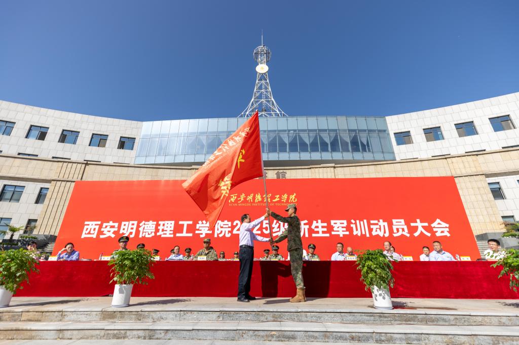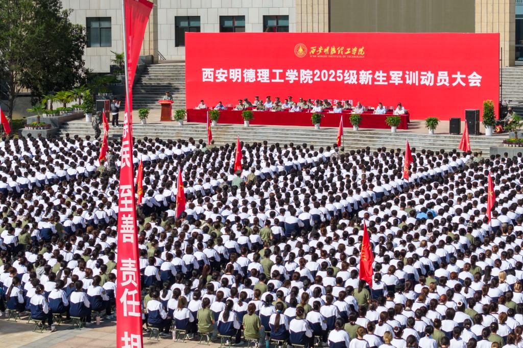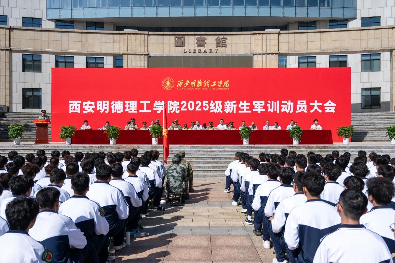 9月8日上午,学校分别在长安校区中心广场、莲湖校区尚德报告厅举行2025级新生军训动员大会。学校校长王志刚、党委书记马川鑫、长安区人民武装部部长张引良、明德源教育集团总裁助理朱延波及全体校领导、相关职能部门、教辅单位负责人、二级学院领导、全体军训旅成员参加本次大会。