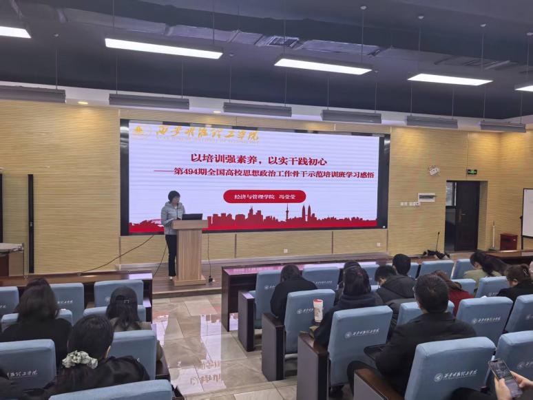 随后,冯莹莹老师围绕“以培训强素养,以实干践初心——第494期全国高校思想政治工作骨干示范培训班学习感悟”进行了交流汇报。她详细分享了参加国家级示范培训的所学、所思、所感,传达了前沿的工作理念与最新的政策导向,并结合自身工作实践,阐述了如何将培训收获转化为推动日常思想政治教育工作创新、服务学生成长成才的实际行动。她表示,将持续以培训提升专业素养,以实干践行育人初心,引发了在场辅导员的广泛共鸣。